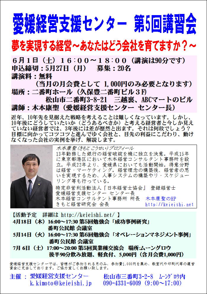 講演会を土日祝祭日にやって欲しいとの要望に応え、「愛媛経営支援センター一周年記念講演」として計画中!