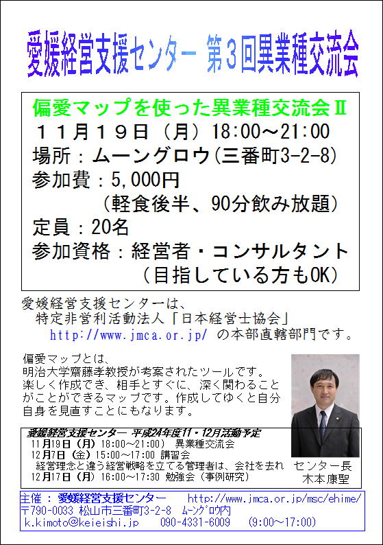 「愛媛経営支援センター」のセンター長木本康聖が、東京で培った実践的なお話を、愛媛でも使える様にお話しします。実用書に載っている理論を伝えるのではなく、本当に実用的なお話を致します。経営の教科書に書かれている専門用語をできるだけ使わずにお話ししますので、経営の本を読んでいない方でも、経営を専門書で学びすぎて頭でっかちになっているかなと不安な方にも役に立つお話です。会社と会社の橋渡し役の経営コンサルタントが、今回は、あなたと専門書の橋渡しを致します。
