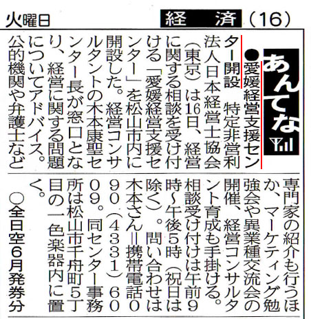 2012.04.17愛媛新聞に愛媛経営支援センター開設の記事が掲載されました